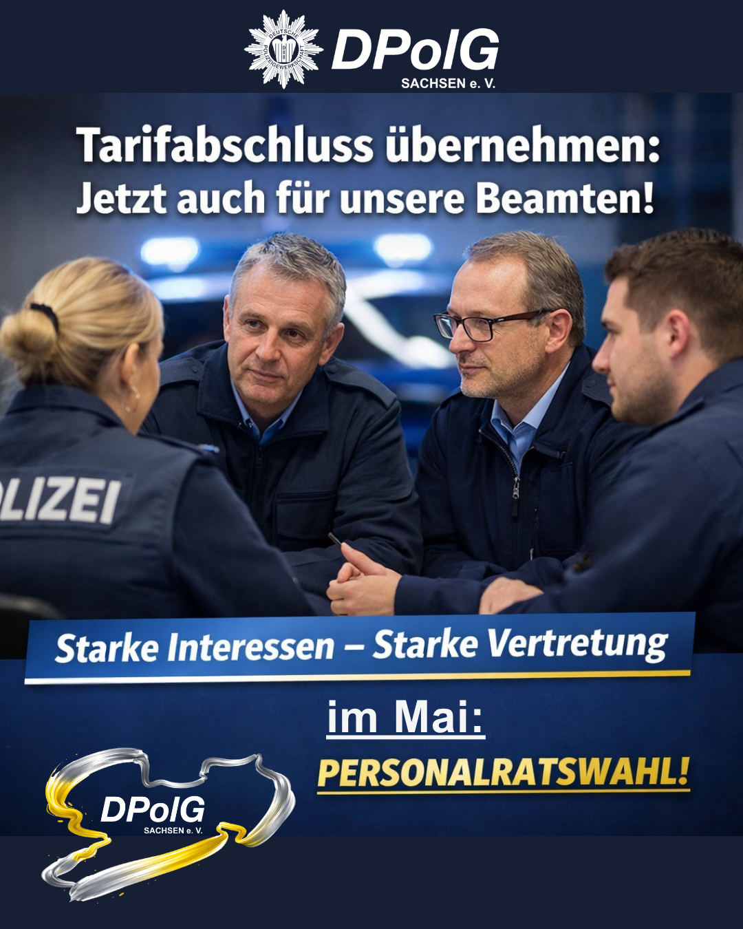 Die Deutsche Polizeigewerkschaft Sachsen (DPolG Sachsen) begrüßt die angekündigte Übertragung des aktuellen Tarifergebnisses des öffentlichen Dienstes der Länder auf die Beamtinnen und Beamten des Freistaates Sachsen.